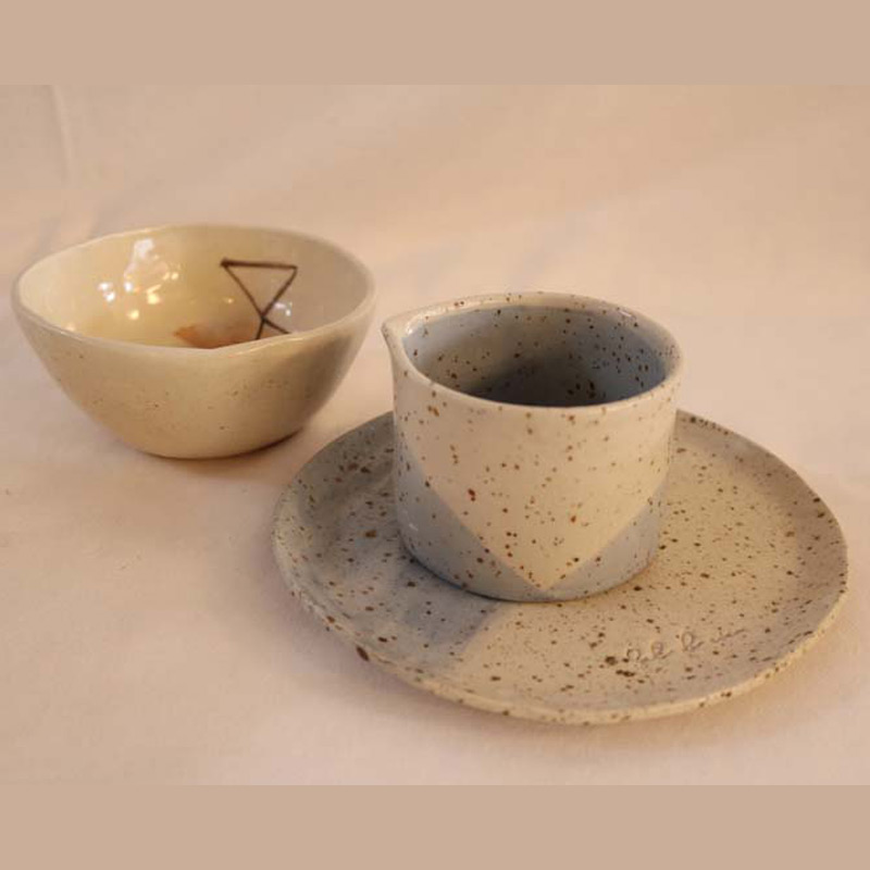 Piezas hecha con gres de alta temperatura con esmalte libre de plomo, aptas para contener alimentos o bebida.