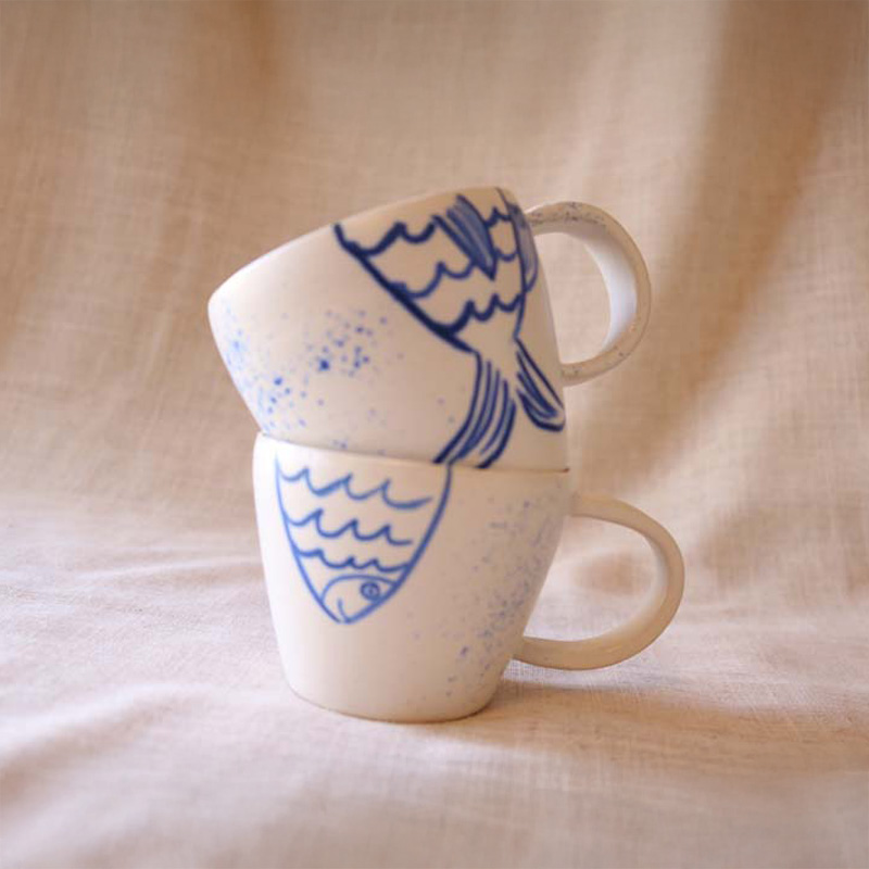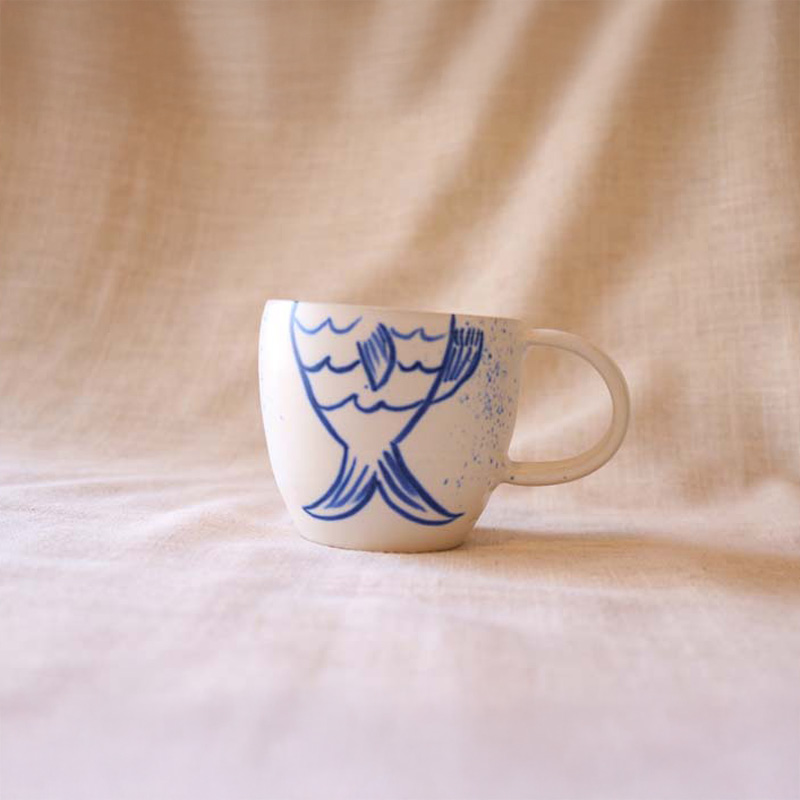 Descubre la magia del mar con esta taza artesanal decorada a mano. Los peces y sus colas ondulantes en azul intenso crean un diseño que fluye con naturalidad, como si estuviera bajo el agua.
